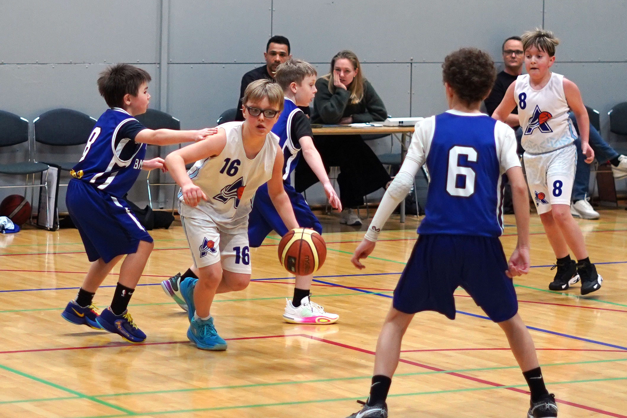 Basketbold, mørk og lys trøje, basketsko, vanddunk og frokost